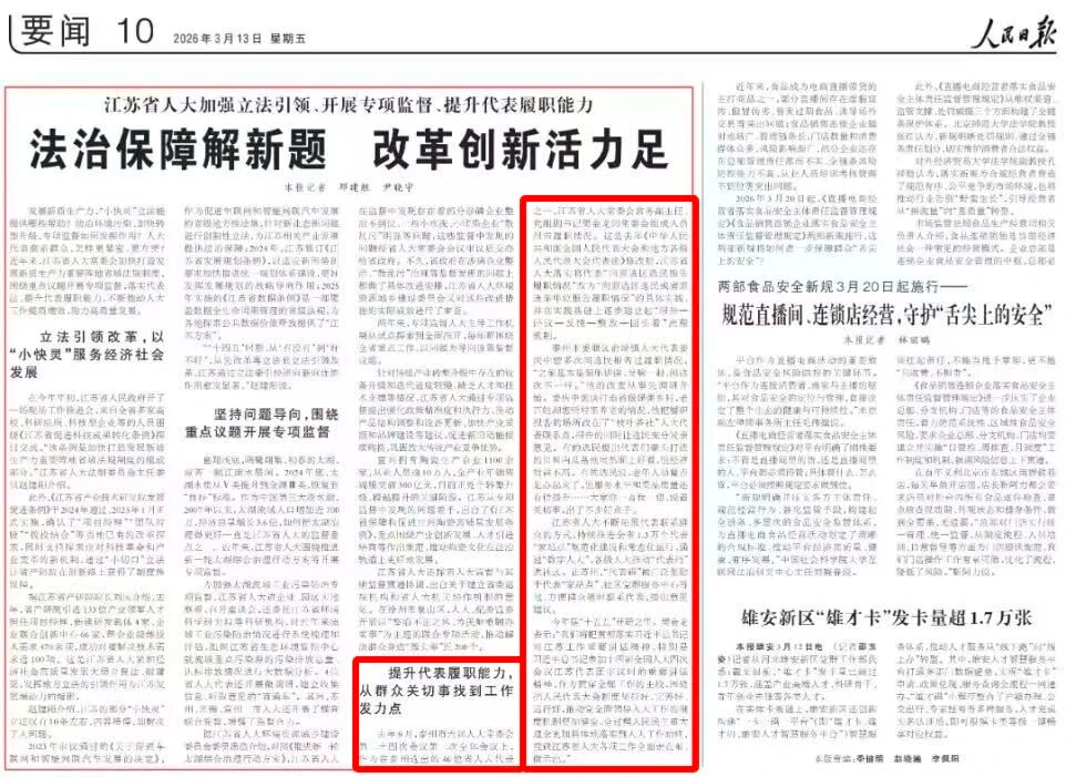 《人民日报》刊载江苏省人大专题文章,推介...