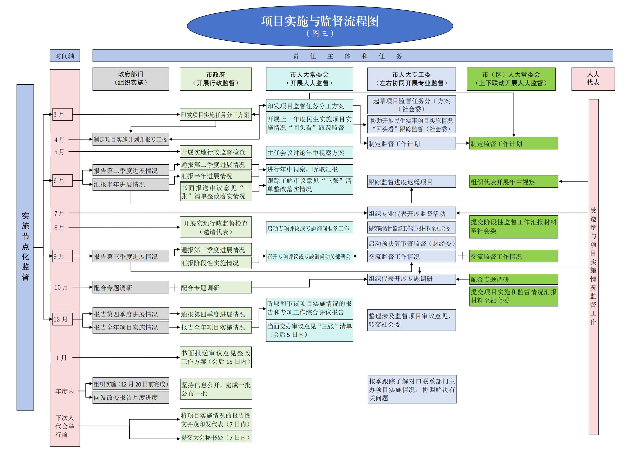 遵照权限法定、运作规范、程序简明的原则,坚持依法依程序开展民生实事项目票决工作。把住报告关。市政府于会前7日内,将初定候选项目具体情况和编制情况说明书面印发给人大代表,保障代表充分酝酿,并提出“关于提请审议民生实事候选项目的议案”。把住说明关。市政府负责人在人代会上就提请的民生实事票决项目名称、主要内容、实施主体、实施计划、完成时限、保障措施等向参会代表作情况说明。把住审议关。邀请有关部门负责同志列席代表团审议,现场解答代表对民生实事项目的工作询问,保障代表充分审议;参会代表根据表决通过的票决办法,按照差额比例投票确定正式项目,并予以公告。 三、绘制实施与监督流程图(图三),全链条督办项目,抓住落实关键点