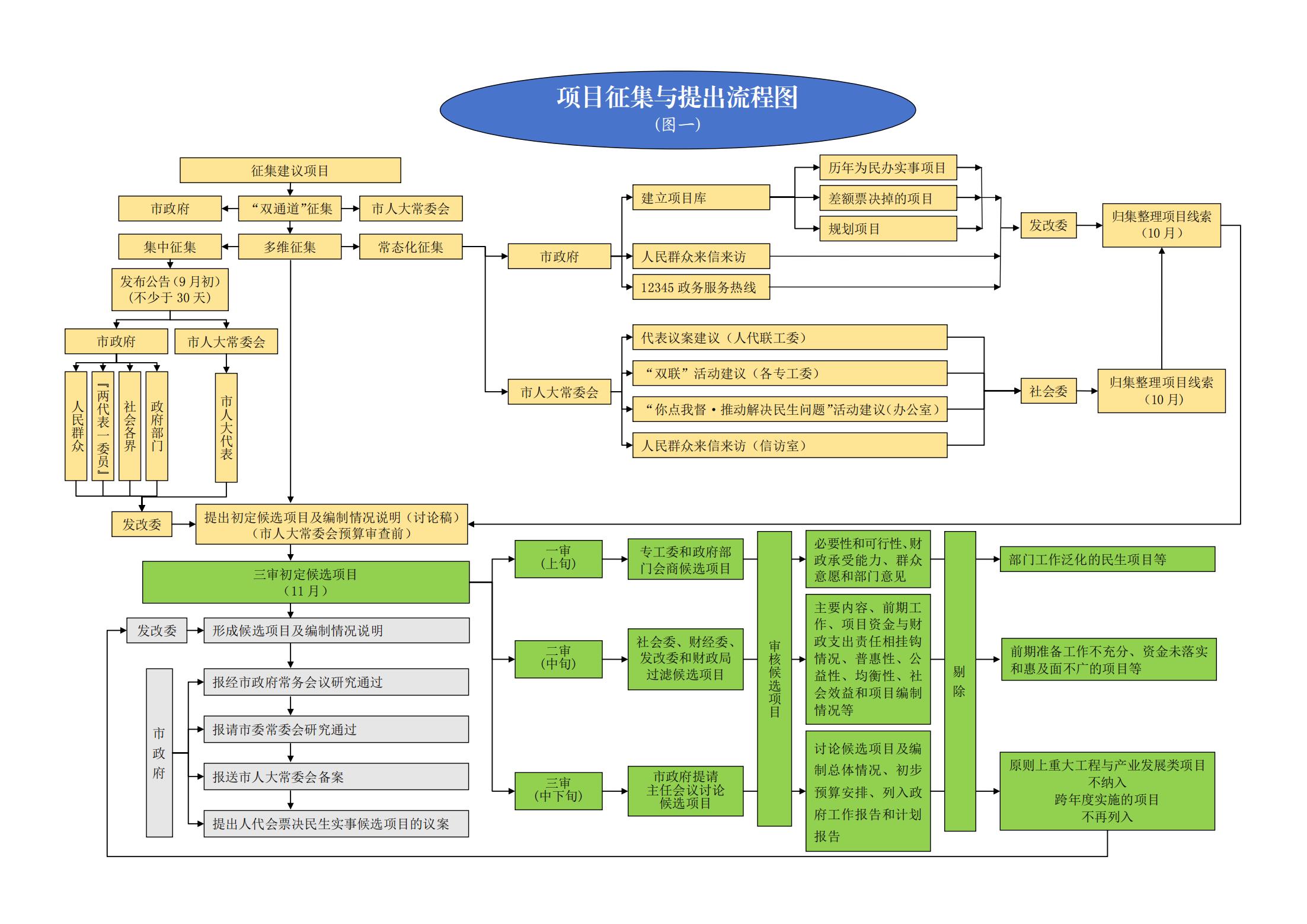 民生实事项目蕴含社情民意、事关百姓福祉。推行民生实事项目人大代表票决制(以下简称票决制)不仅是推动经济社会高质量发展、解决人民群众日益增长的美好生活需要与不平衡不充分发展之间矛盾的重要抓手,更是践行全过程人民民主的一项重要举措。为更好地规范和指导票决制工作,提升票决制工作程序化、制度化、规范化水平,根据省人大常委会和泰州市委有关文件规定,结合我市两年多的探索实践,泰州市人大常委会绘制了市政府民生实事项目人大代表票决制全生命周期流程图,对票决制工作的程序和环节、主体和任务、标准和方法等以图表的形式进行表述,使票决制工作思路更清晰、任务更明确、责任更明了、流程更顺畅。现将有关情况说明如下。 一、绘制征集与提出流程图(图一),全覆盖征集项目,把握社会关注点