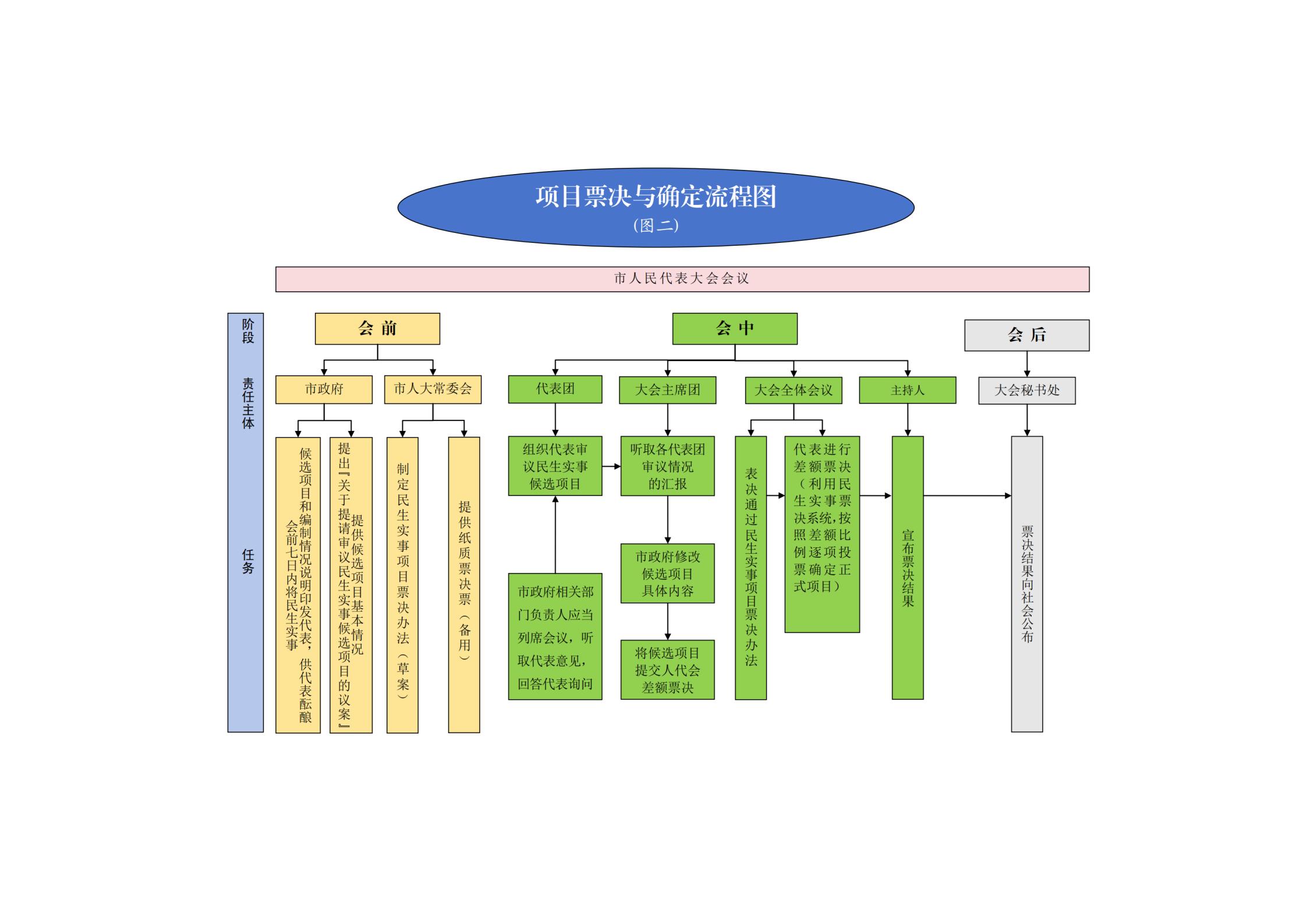 民生实事项目聚焦在托育、教育、就业、医疗、养老、住房、社保等诸多领域,与人民群众息息相关,且感受最为强烈,靶向瞄准了经济社会发展中的民生“短板”、社会“痛点”。征集主体多通道。市政府通过建立项目库、接受人民群众来信来访、接听12345政务服务热线以及“两代表一委员”的意见建议征集民生实事建议项目。市人大常委会通过收集人大代表议案建议、“双联”活动建议、开展“你点我督”推动解决民生问题活动以及接受人民群众来信来访等征集民生实事建议项目。征集方式多渠道。坚持集中征集和常态化征集相结合、自下而上和自上而下相结合,市政府每年9月初发布项目集中征集公告,征集时间延长至不少于30天。制定民生实事五年规划,建立民生实事项目库。征集初定多审道。充分论证项目的必要性、可行性、普惠性、公益性等情况,剔除前期准备工作不充分、资金未落实和惠及面不广等项目,在市委常委会研究通过民生实事候选项目前,三审过滤精筛候选项目,促进民生实事项目更加贴近群众需求,符合群众意愿。 二、绘制票决与确定流程图(图二),全过程票选项目,找准代表聚焦点