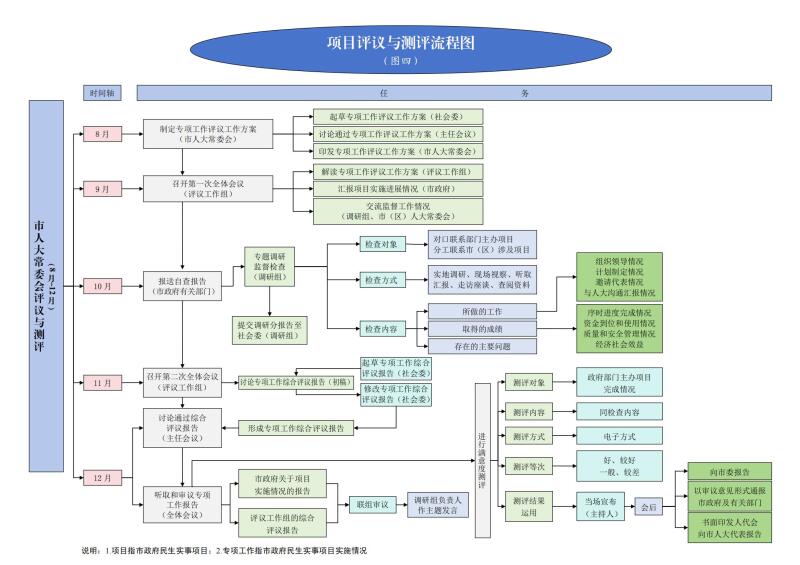 民生实事项目的“出炉”仅仅是票决工作的第一步,民生实事项目的实施并完成才是目的。综合运用调研视察、听取汇报、专项评议、专题询问等多种形式,全链条监督项目的实施进度、质量管理、资金使用等情况。清单化派单监督。市人大常委会4月初印发监督任务清单化分工方案,8月初印发阶段性监督工作情况“三张提醒清单”和项目评价报告模板,12月将审议意见“三张清单”交付市政府及其有关部门,次年6月跟踪审议意见“三张清单”整改落实情况。节点化跟踪监督。市人大常委会将市政府民生实事项目实施情况监督工作列入常委会监督工作计划,盯住四个时间节点,实施节点化监督,使民生实事监督工作的频次和力道都恰到好处。全年开展2次集中视察,听取2次工作汇报,开展1次工作评议或专题询问。“回头看”跟踪监督。市人大常委会每年3月对市政府上一年度民生实事项目实施进度或效果没有达到预期目标的、满意度测评时存在“较差”评价的、已完成项目后续运营维护管理、跨年度实施项目的年度计划及实施情况等工作开展“回头看”跟踪监督,使民生实事项目成效经得起群众检验、实践检验和历史检验。 四、绘制评议与测评流程图(图四),全方位评议项目,提升群众满意点
