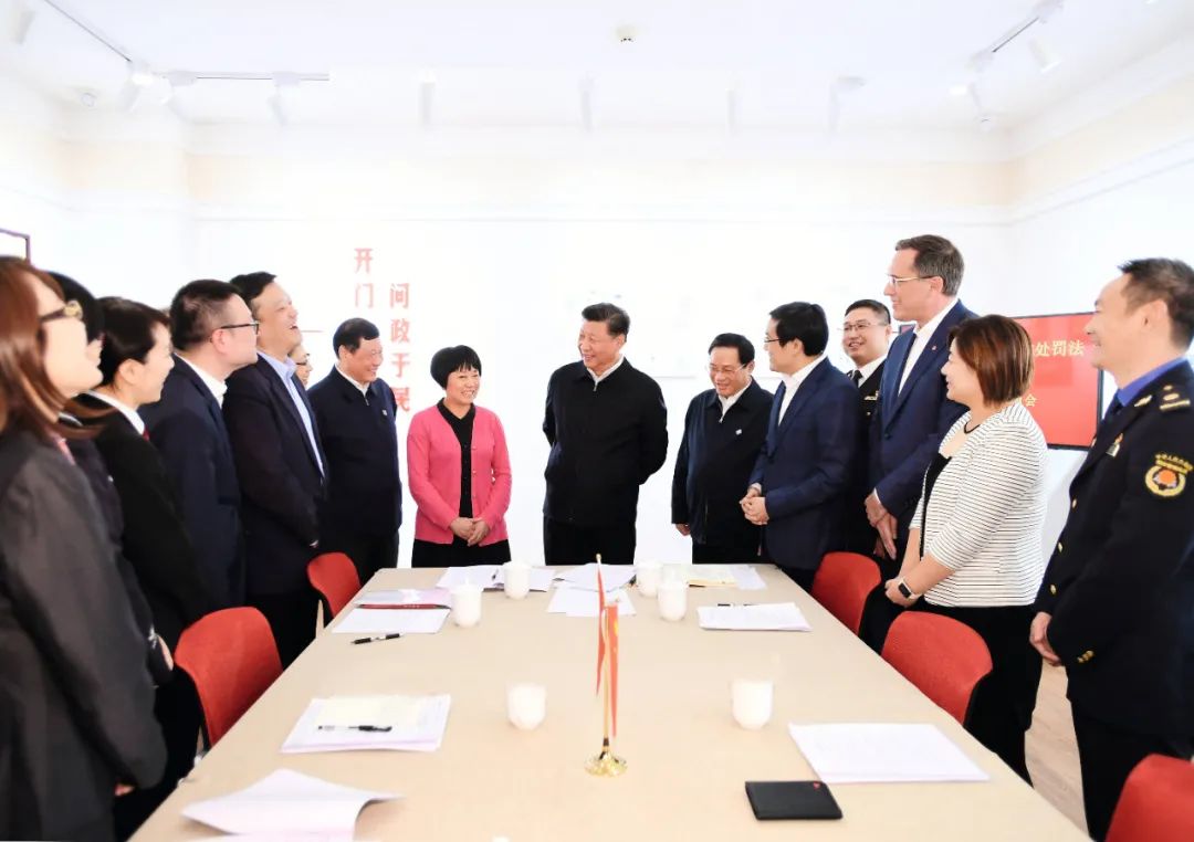 2019年11月2日,习近平总书记在上海虹桥街道古北市民中心,同正在参加立法意见征询的社区居民代表亲切交流。习近平总书记指出:“我们走的是一条中国特色社会主义政治发展道路,人民民主是一种全过程的民主”。摄影/新华社记者 谢环驰