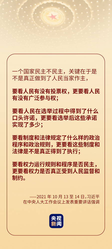 保证和支持人民当家作主,在这次中央人大工作会议上,习近平总书记强调一个重大理念——全过程人民民主。 “人民民主是一种全过程的民主,所有的重大立法决策都是依照程序、经过民主酝酿,通过科学决策、民主决策产生的。”2019年11月,习近平总书记在上海调研时这样说。 今年3月,十三届全国人大四次会议对全国人大组织法和全国人大议事规则作出修改,将全国人大及其常委会坚持全过程民主写入法律。 今年的“七一”重要讲话中,习近平总书记强调“践行以人民为中心的发展思想,发展全过程人民民主”。